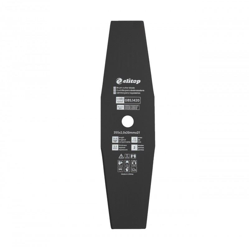 Lâmina Elitop para roçadeiras com 355 mm (14") e 2 pontas, feita em aço endurecido, com furação de 20 mm. Proporciona cortes eficientes e durabilidade superior para jardinagem residencial.
