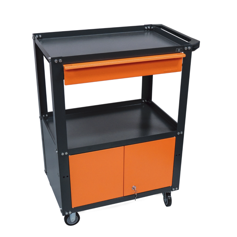 Versatilidade máxima em um só carrinho. O Carro Presto 91003 combina 1 gaveta telescópica, prateleiras reforçadas e um compartimento fechado com 2 portas. Suporta 120 kg, possui pintura antiferrugem e rodízios resistentes. A solução ideal para quem precisa de organização híbrida na oficina.