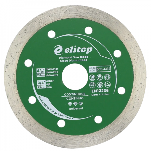 Disco de corte diamantado 110mm contínuo, ideal para cortes precisos em porcelana, cerâmica, mármore e azulejo. Alta performance e durabilidade.
