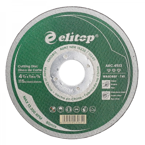 Precisão cirúrgica e alta velocidade. Disco de Corte Elitop Premium Extra Fino (115mm x 1.0mm) para Aço Inox e Carbono. Com apenas 1.0mm de espessura, oferece o corte mais rápido da categoria com o mínimo de desperdício e aquecimento. O padrão ouro para serralheria fina e manutenção industrial.
