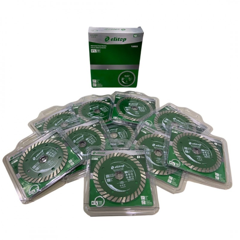 Kit com 10 discos diamantados turbo 110mm, ideais para cortes rápidos e eficientes em materiais duros como porcelanato, cerâmica, mármore e azulejos.