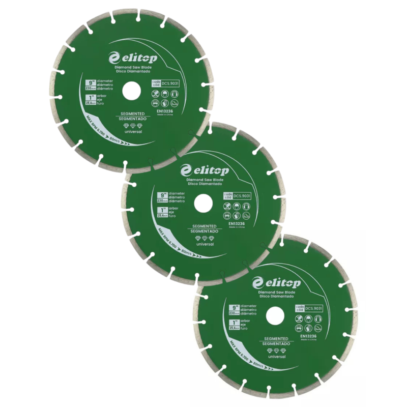 Kit 3 Discos Diamantados 230mm (9") Segmentados. Desenvolvidos para concreto, granito, tijolo e alvenaria, estes discos suportam até 6.700 RPM, oferecendo alta performance em cortes a seco ou úmidos. O design segmentado reduz o aquecimento e prolonga a vida útil do diamante, garantindo agilidade e precisão em obras e reformas. Versatilidade total com furo de 25,4mm e adaptador para 22,2mm.