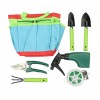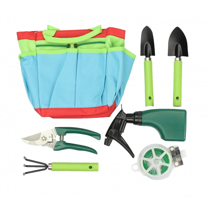 Kit de jardinagem com 6 peças essenciais: frasco de spray, tesoura de poda, 2 pás, ancinho e rolo de cabeça, tudo em uma bolsa de lona prática.