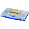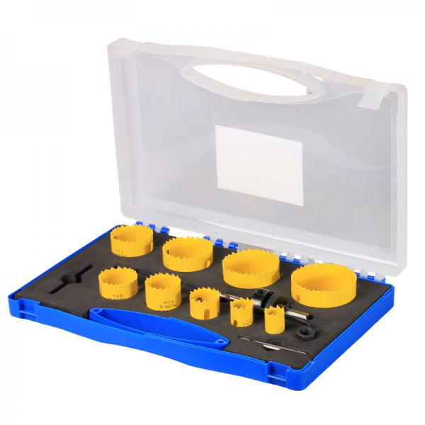 O kit inclui 9 serras copo com profundidade de 32 mm e diâmetros variados, além de eixos, brocas piloto e porca adaptadora, tudo armazenado em um estojo resistente e prático para transporte e organização.